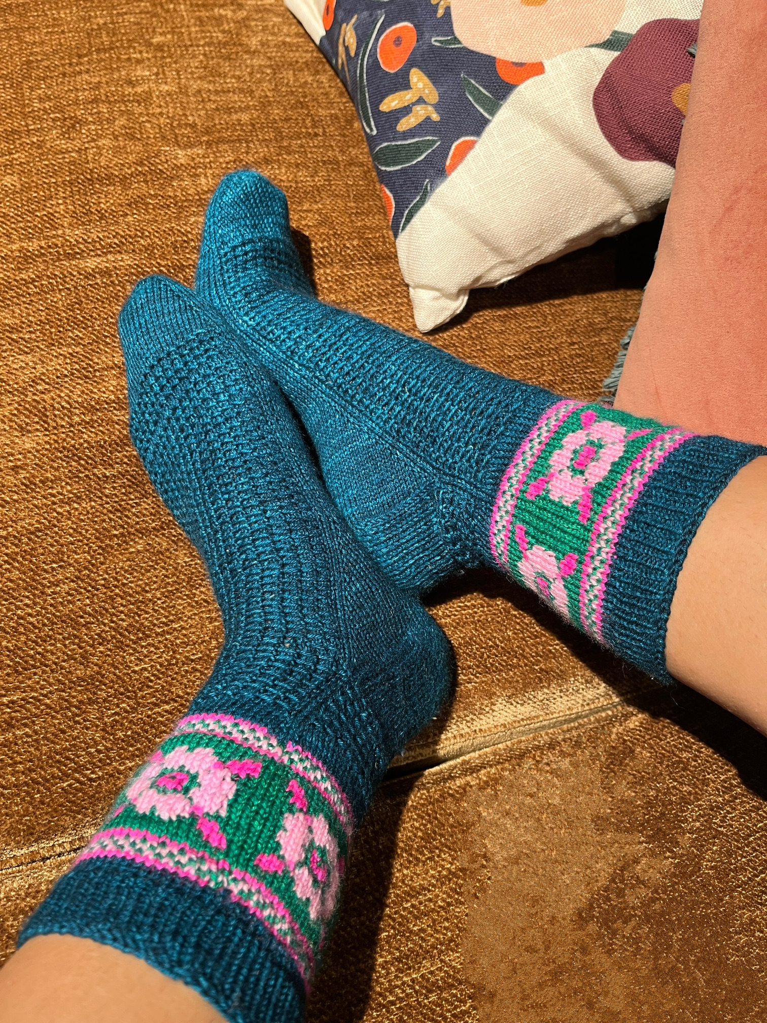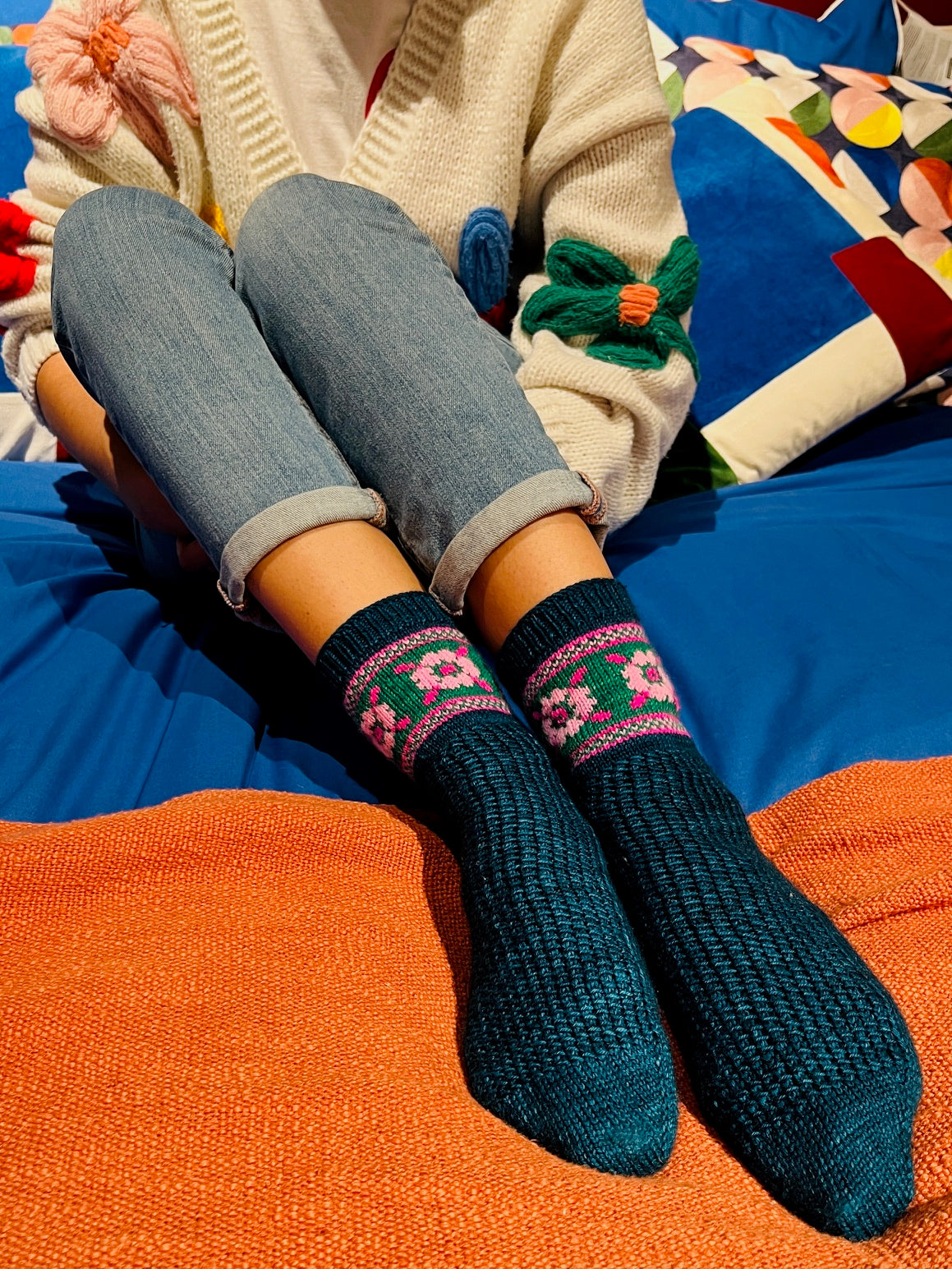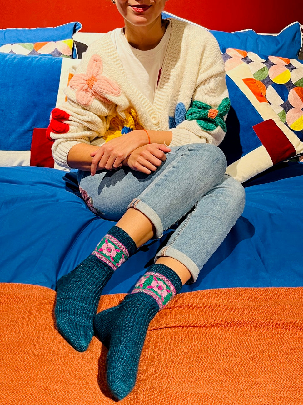 Techniques utilisées : Montage par la pointe, montage magique de Judy, talon en rangs raccourcis, rabat élastique de Jeny et jacquard.