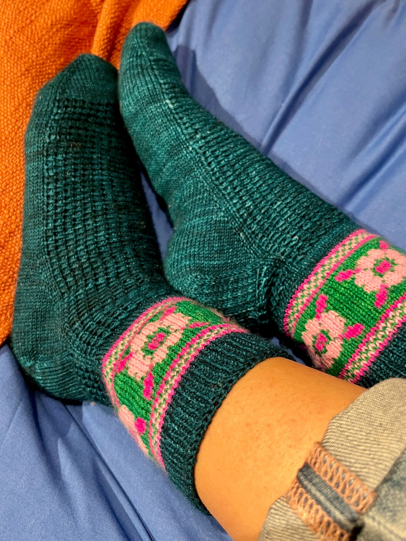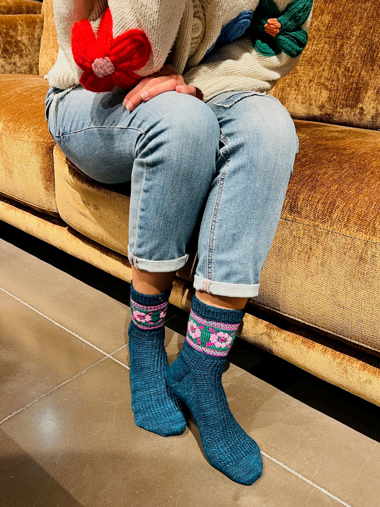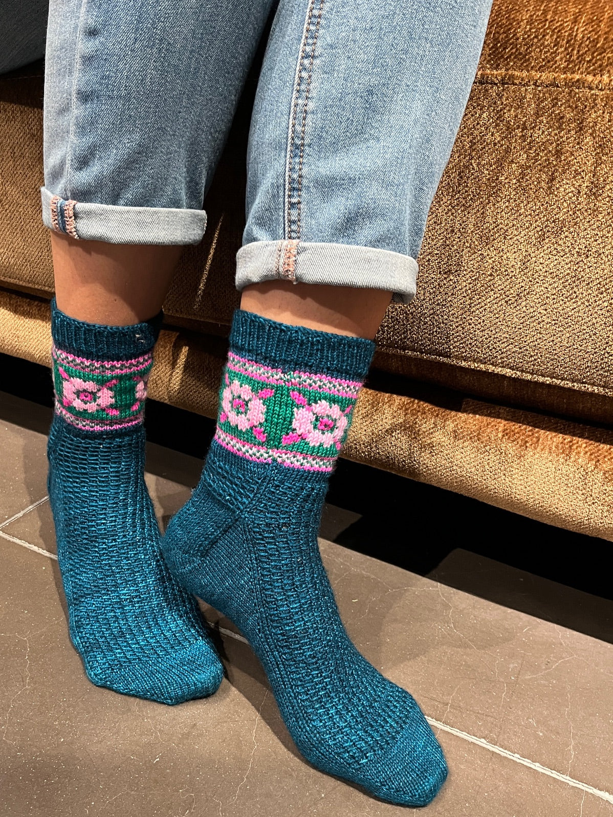Techniques utilisées : Montage par la pointe, montage magique de Judy, talon en rangs raccourcis, rabat élastique de Jeny et jacquard.